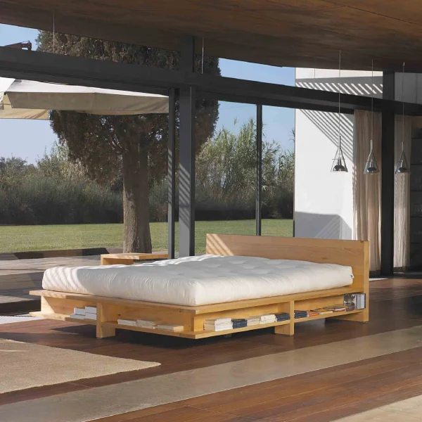 Byblos is an ecological bed made of solid beech from controlled cultivation, made unique by the bookcase compartment running along the base.