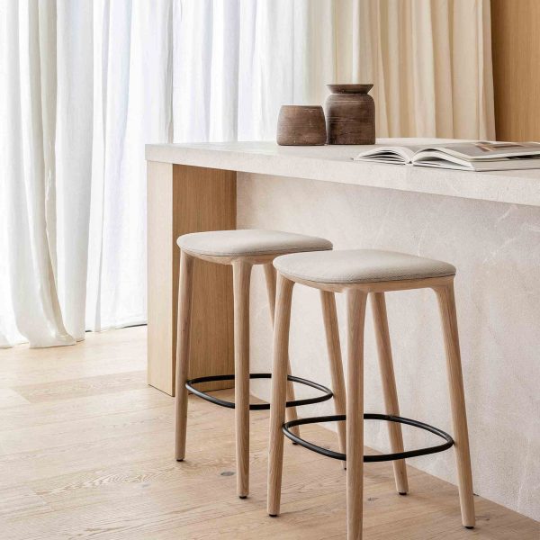 Neva is a stool designed by Regular Company for Artisan. It is made of solid wood and features soft, light lines with a metal footrest. The seat is made of wood or upholstered in fabric or leather. The Artisan brand specializes in the handcrafted production of solid wood furniture. It has more than 50 years of experience and collaborates with the best local and global designers. Artisan uses only natural wood from renewable sources and uses only natural materials such as oils and beeswax for its treatment.