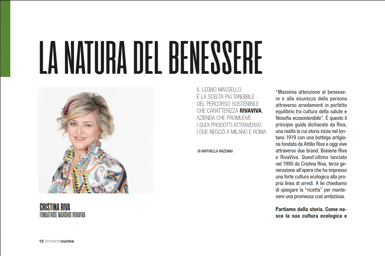 E’ questo il principio guida dichiarato da Riva, una realtà la cui storia inizia nel lontano 1919 con una bottega artigiana fondata da Attilio Riva e oggi vive attraverso due brand, Boiserie Riva e RivaViva. Quest’ultimo lanciato nel 1990 da Cristina Riva, terza generazione all’opera che ha impresso una forte cultura ecologica alla propria linea di arredi. Nel n. 277 di Ambiente Cucina l‘Architetto Cristina Riva ha spiegato la “ricetta” per mantenere una promessa così ambiziosa.