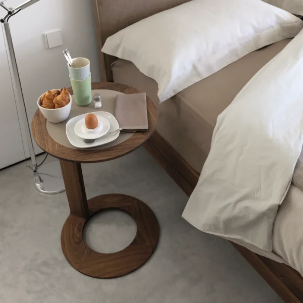 Loup è un vero e proprio tuttofare e si adatta perfettamente a usi diversi in tutte le zone della casa, affascinando con i suoi eleganti giunti in legno e i dettagli curati. Elementi caratteristici del suo design sono due anelli riuniti da un elemento verticale. Le superfici assottigliate sul lato inferiore del piano e sul lato superiore della base conferiscono a loup un aspetto che per questi spessori è sorprendentemente snello e leggero. Il piano è incassato a filo.
