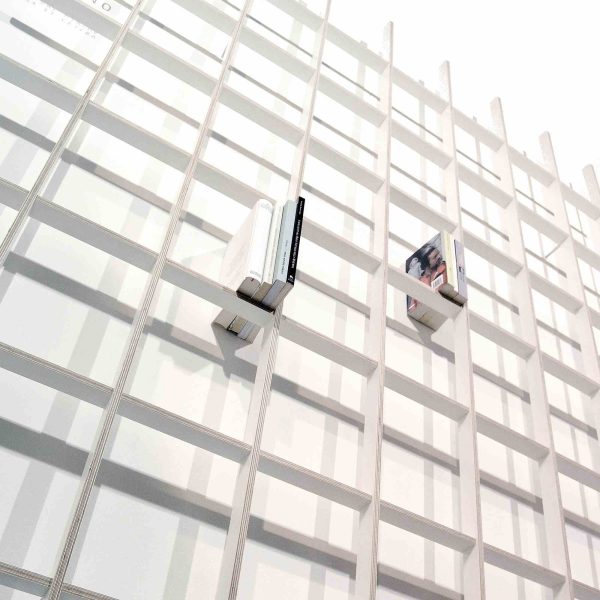Reticola è una libreria minimale caratterizzata da un’ariosa griglia che si apre come un ventilatore, distanziata dalla parete da 4 cilindri satinati e inclinata con un angolo di 3°, producendo un’ombra scultorea proiettata sul muro. Con la punta di un dito si può scegliere un libro e inclinarlo verso di sé.