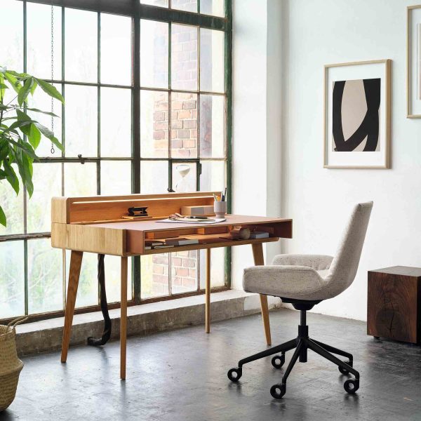 In versione free-standig o con due gambe: Sol, con il suo design pulito, è un eccellente compagno per qualsiasi zona della casa. Due piani scorrevoli, posti intelligentemente uno dentro l’altro – uno in legno, l’altro con rivestimento in pelle – costituiscono l’idea centrale di Sol. Il piano di Sol è estraibile e si blocca in apertura e in chiusura. Una presa di corrente con collegamento USB e l’innovativa ricarica wireless per smartphone o tablet per alimentare qualsiasi dispositivo; scomparti per utensili e accessori, una scanalatura portapenne e un cassetto segreto per organizzarsi meglio. Per un’illuminazione ottimale è disponibile un’alzata con illuminazione LED regolabile. Infine, una canaletta in Stricktex raggruppa i cavi sparsi. Sol è disponibile anche senza sopralzo.
